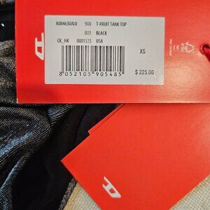 Slim fit. Pullover. Metallic ruched sleeveless tank top from Diesel featuring black, stretch-design, ruched bodice, round neck and straight hem. Metal "D" Diesel sewn into the fabric. 93% Polyester 7% Elastane.