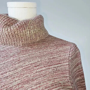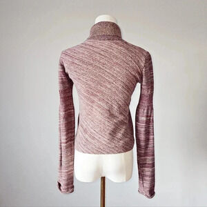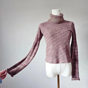 Diesel cropped turtleneck sweater in a soft heathered faded maroon. Features unique sleeves with ruched detailing for added style and comfort. Subtle gold metallic accents on the collar. Perfect for casual or layered looks.