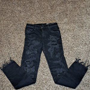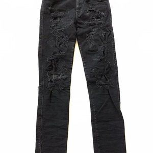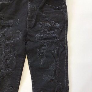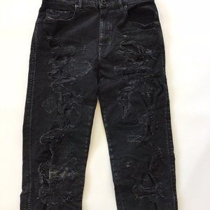 Diesel Ladies Black Distress Jeans W26-L32 Regular straight Regular waist Very lightly worn condition. Some stretch. Width 26, Length 32. Heavily Distressed.98% Cotton 2% elastane. No actual holes all patched. Some areas under the distressing have a leather look. Regularly $250