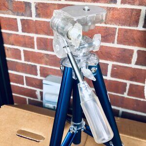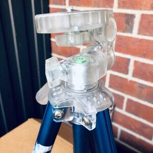 Adjustable 3-section aluminum tripod by Digipower, model TP-TR47DBL. Sleek metallic blue finish, clear plastic fluid head with built-in bubble level, and quick-release platform. Height range 35 – 95 cm. Ideal for creators, travelers, or photography lovers. Excellent pre-owned condition, from a smoke-free home.