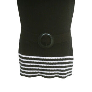 Black and white knit top. Striped cowl neckline with striped hem. Knitted faux black belt with black plastic detail. Extra long hem. Knit is soft to the touch.