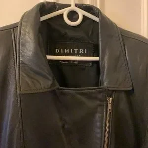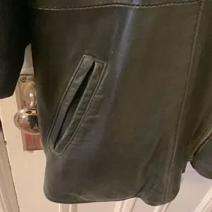 Made in Canada this soft leather jacket is really special. A long zip goes from the neck down. It is 24 inches. Pit to pit is also 24 inches. 31 inches down from the back of the neck. There is a repair on the inside collar. I will lower the price for this. It can be seen in the picture. Also two little tears, in the picture that are not very noticeable. Open pockets.