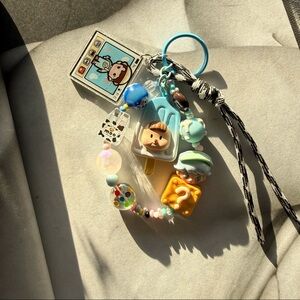Dimoo style bag charm with colorful beads and a cartoon figure. Playful and ideal as a bag charm or Keychain accessory.