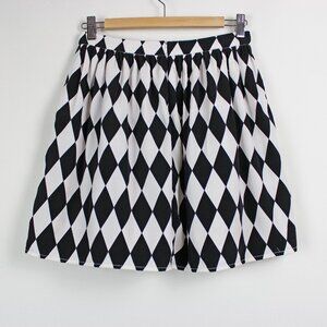 A whimsical mini skirt in a classic black and white harlequin diamond pattern. It has a mesh tulle underlayer to give it a little bit of airy volume and shape. It’s high-waist and falls about mid-thigh or slightly lower. Perfect for spring and summer, and transitions nicely into layered fall and winter looks. Gently worn, great condition.