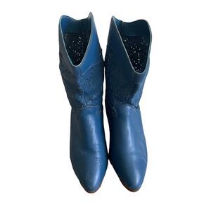 DINGO Vintage Blue Perforated Leather Almond Toe Cowboy Cowgirl Western Boots Heel Blue Size 9 Heel Height Approximately 1.5-1.75” Very good condition One tiny red mark on very upper outer top Bottom part of heel covering has a bit that has come off. Zoom in on last pics Few scuffs / markings (polish should fix) stampede, casual, country, boho, rare, unique, heel, heeled boots, western, cowboy, cowgirl,