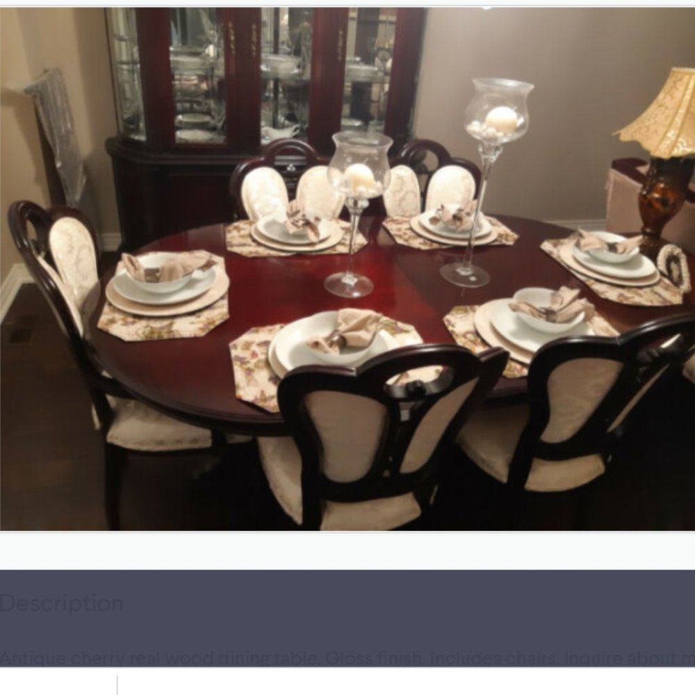 Antique cherry real wood dining table. Gloss finish. Includes chairs, Inquire about matching hutch if interested.