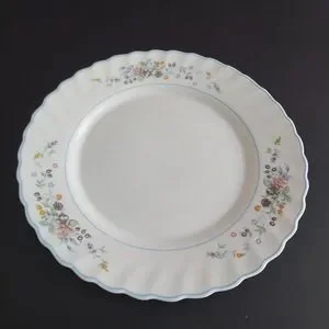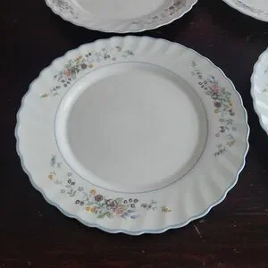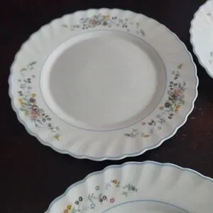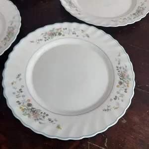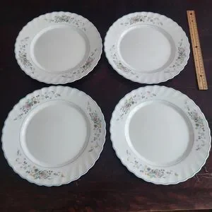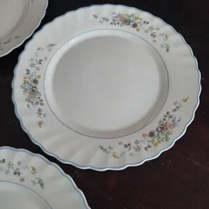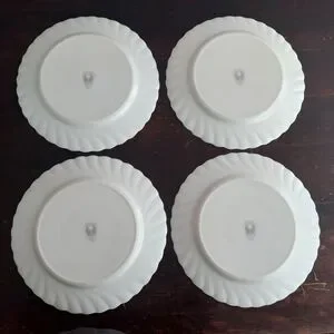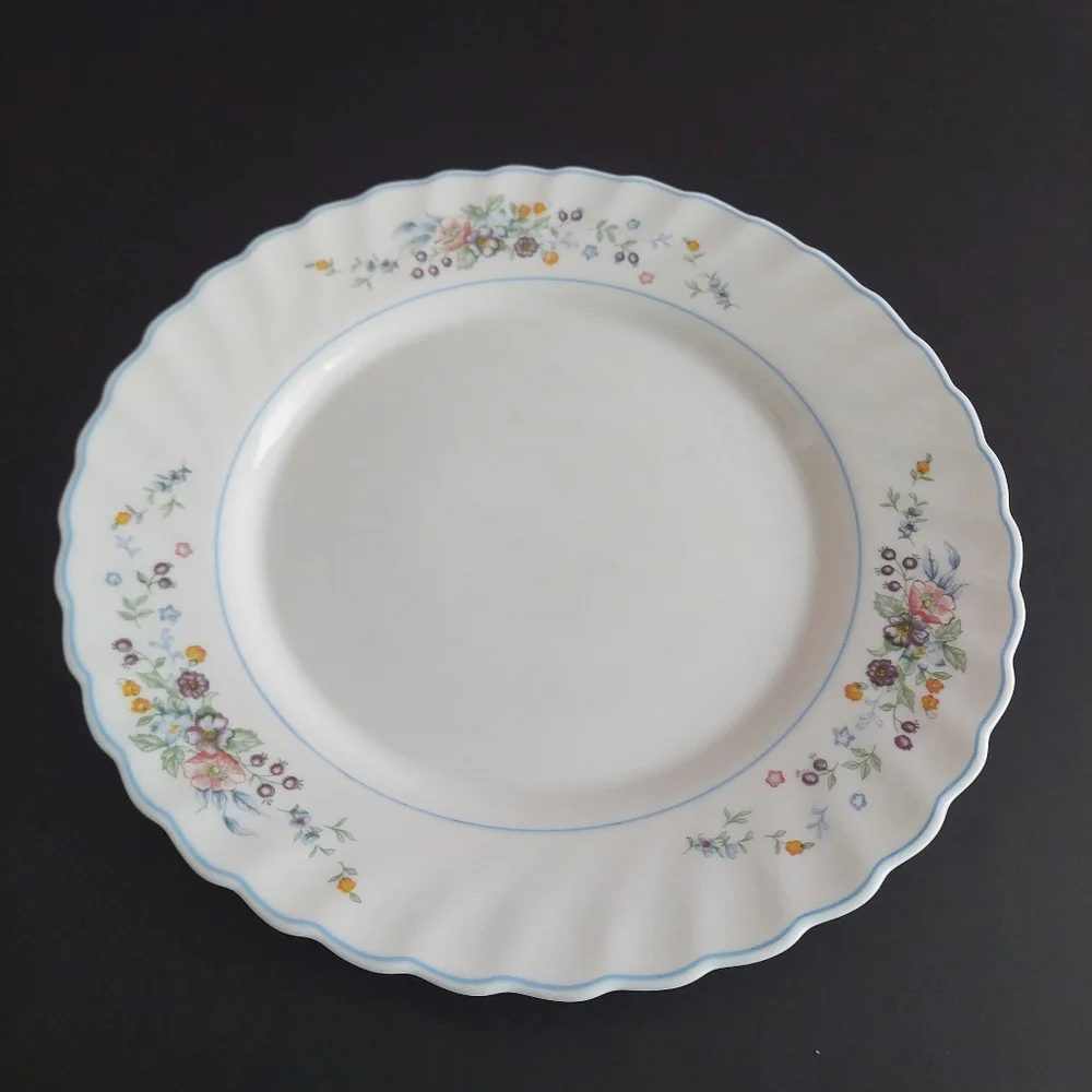 4-piece vintage Arcopal dinner plate set in the discontinued Victoria pattern. Multi-color floral pattern on white tempered glass. Swirled rim with light blue trim. Made in France, circa 1990s