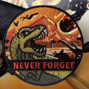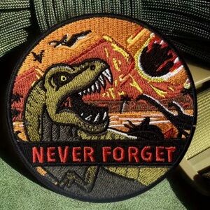Round patch featuring a dinosaur and 'Never Forget' text. Vibrant colors with a prehistoric theme.