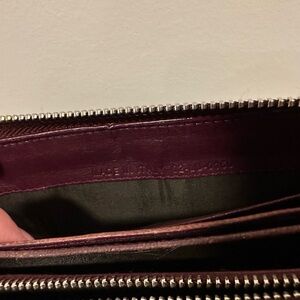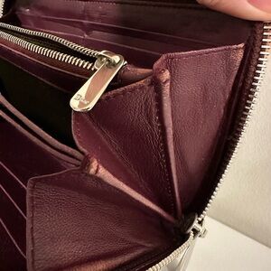 The burgundy patent on the outside has a few minor scratches that aren't too obvious unless you're looking for them (included a close up photo of some of the mild scratching on the patent but it’s very hard to pick up in the light due to the shine of the patent.) There’s a small scratch on the external zipper pull. The burgundy regular leather on the inside was in pretty dry shape when I got it, so I've given it a nice spa day with some leather cleaner and conditioner. While the inside leather is looking much happier overall now, there's still some visible wear in on the edges and creases from use which are shown in the photos - a good leather conditioner can work some near-miracles but it's not actually magic. Overall, it's in good used condition, looking beautiful, and ready to use!