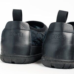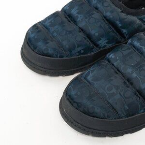 Circa 2020, these snow slippers from Dior in the "Black" colourway are crafted with a quilted navy Oblique nylon on the upper, and feature black leather trim, closed rounded toes, elasticized toplines, back pull-tabs, and rubber soles.
