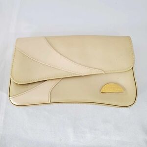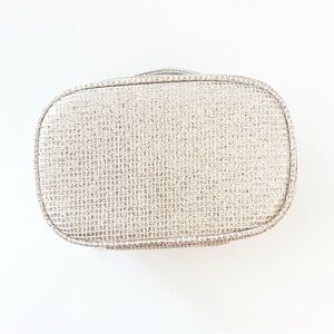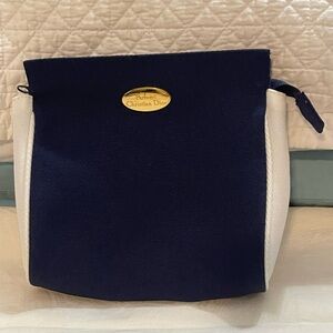 Chic Dior cosmetic case with gold texture. Features elegant design and iconic logo.