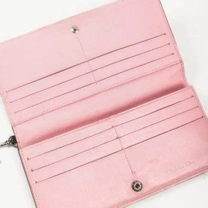 A long flap wallet from the Lady Dior line that epitomizes Dior’s vision of elegance and beauty. Crafted from soft lambskin leather in black with the signature Dior Cannage stitching, this stunning wallet features a silver-tone “D.I.O.R.” charm with pink enamel and a press stud closure that opens to a soft pink leather-lined interior with one gusseted compartment, a single zip coin compartment, twelve card slots, and a long flat pocket.