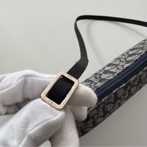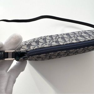 Stylish Dior trotter canvas vintage shoulder bag with iconic monogram pattern. Features a sleek black/navy and gray design.
