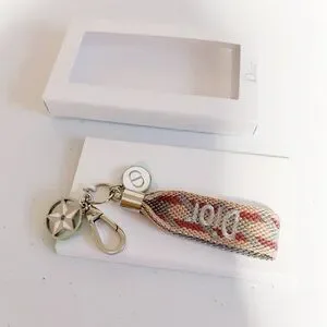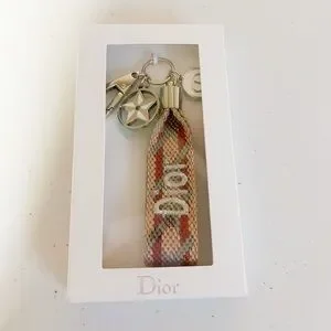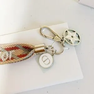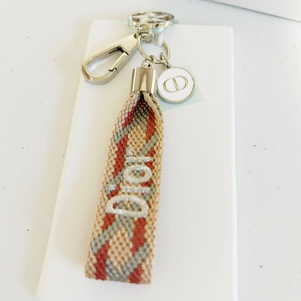 Stylish Dior keychain with woven design. Features a mix of colors and metal accents. Perfect for adding elegance to your keys.