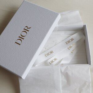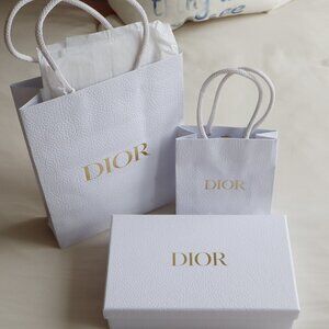 Great condition. The paper bags are a little bent from transport but not very noticeable. The box measures 8.5" x 5" and the bags measure 9" x 7.5" and 4.5" x 5". Box will come with the original wrapping and ribbon. Authentic - from a purchase at the Dior store.