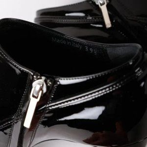 Christian Dior patent leather stiletto heel with platform in shiny black. This style features a round toe, silver-toned hardware engraved with the iconic Dior name, and concealed silver zippers on the side.