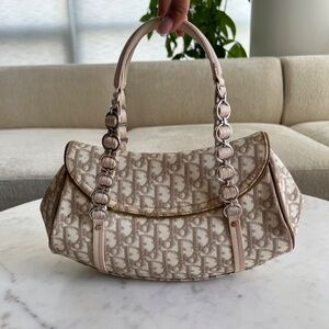 Chic and feminine Dior bag featuring the beige/cream monogram canvas, leather trim, silver-tone hardware, and a signature Dior bow detail. Double handles with chain links give it a stylish finish. Spacious yet elegant perfect for everyday wear or a polished evening look.