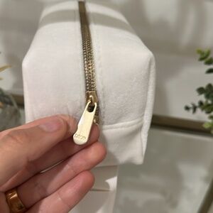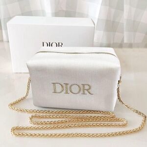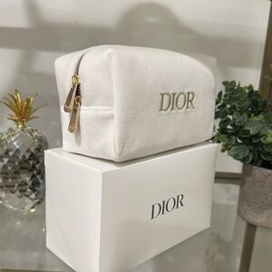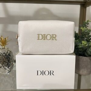 This Dior cosmetic bag features a minimalist rectangular design in a pristine white color, crafted from a durable textured fabric.
