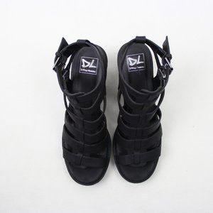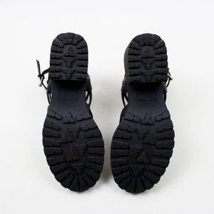 Chunky heel sandals in a matte black finish. Gladiator inspired, comes with double ankle straps with two adjustable silver buckles. The upper cage and round open-toe design give your feet room to move and breathe with ease. With track soles, they provide traction and sturdy support. New without box. Great condition.