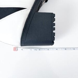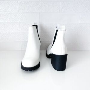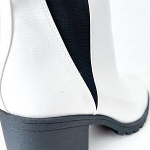 Stylish ankle boots with a sleek white finish. Black elastic side panels for easy wear. Chunky black heel for added height.