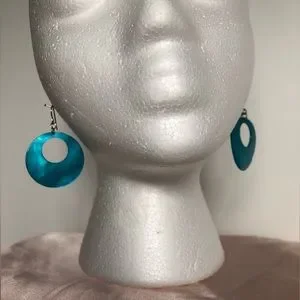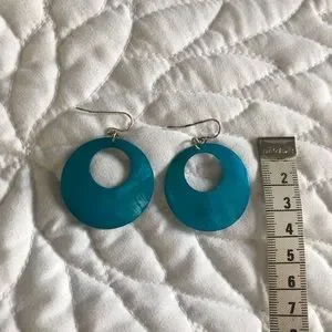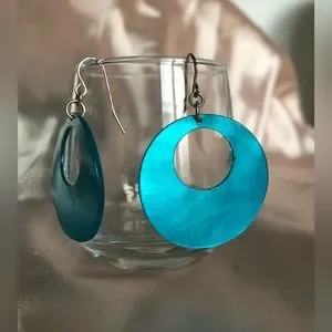Iridescent blue shell discs on silver tone wires. GU condition.