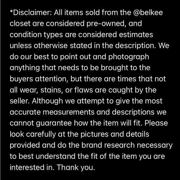 *Disclaimer: All items sold from the @belkee closet are considered pre-owned, and condition types are considered estimates unless otherwise stated in the description. We do our best to point out and photograph anything that needs to be brought to the buyers attention, but there are times that not all wear, stains, or flaws are caught by the seller. Although we attempt to give the most accurate measurements and descriptions we cannot guarantee how the item will fit. Please look carefully at the pictures and details provided and do the brand research necessary to best understand the fit of the item you are interested in. Thank you.