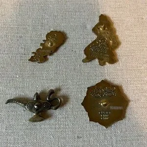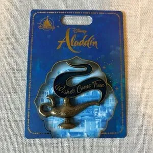 Set of five pins from the live action Aladdin film. Used for display purposes. The backs of a few of the pins are discoloured due to my pin board but fronts are all in great condition.