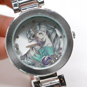 Dive into the magic of Disney with this beautiful and gently used Ariel "The Little Mermaid" wristwatch. This watch features a classic silver-toned link band and an elegant face showcasing a silhouette of Ariel. The bezel is accented with sparkling floating rhinestones, adding a touch of enchantment.