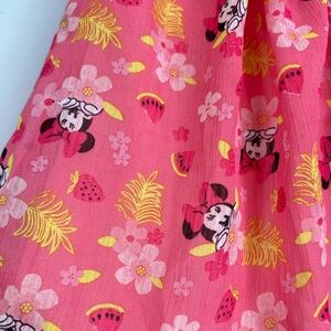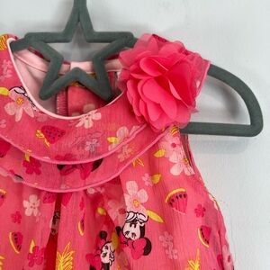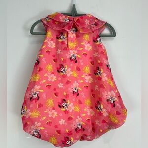 The absolute cutest Disney Baby romper. On the older style Disney tag. Sheer outer material, but perfectly lined, making this great for summer, the beach, vacation, casual, or more dressy wear. Really cute neckline with a 3D flower embellishment. Beautiful pink colour with an all over print of Minnie Mouse, and strawberry and watermelon fruits and flowers. Snaps for easy changes.