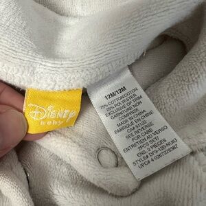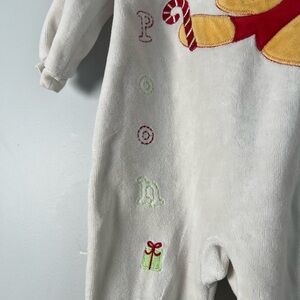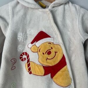Disney Baby footed sleeper. Off white, almost cream colour with velour soft cozy material. Snaps for easy changes in a diagonal design for added style. Winnie The Pooh on the front in a Christmas winter theme! Y2K Disney Baby tag.