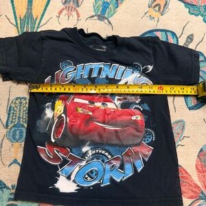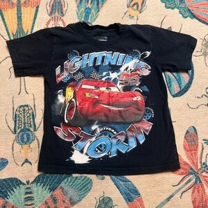 This Disney tee features a striking design of Lightning McQueen from Cars, set against a black background with bold red accents. The short sleeve style offers comfort and a dynamic racing-themed graphic print that fans will love. AOP and the graphic is in good shape.