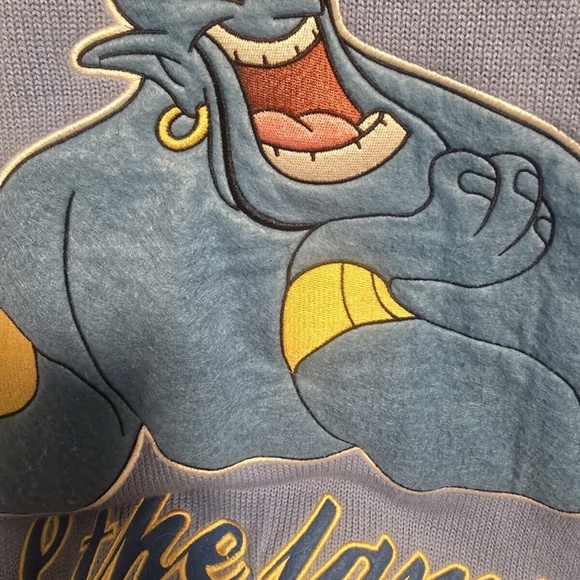 his is a vintage Disney cardigan featuring a Genie character design from 1992. It has a V-neckline, long sleeves, and is made of blue acrylic knit fabric. The cardigan is in size M and includes pockets. The brand is Cakeworthy, and it has a nostalgic 90s theme, making it a stylish and unique piece for any Disney fan.