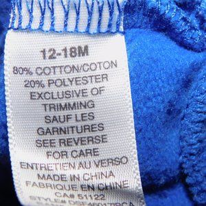 This Boys 12-18 Months Disney Cars Lightning McQueen Varsity Style Jacket is in great clean bright Condition. Jacket is 80% Cotton - 20% Polyester - machine washable. Features snap button closure - 2 Faux front pockets. Embroidered Image of Lightning McQueen on chest and Embroidered LM on other side of the chest. Blue body and white sleeves.