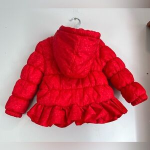 The cutest Disney Elena of Avalor puffer jacket. Vibrant red colour with a subtle all over print of flowers. Appliqué of Elena on the front. Complete with ruffles, snaps and a hood!