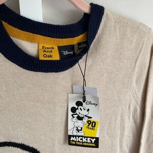 Stylish cream sweater with a navy collar. Features a classic Mickey Mouse design. Perfect for Disney fans.