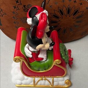Delight in the holiday spirit with this Disney sleigh featuring Mickey and Minnie. Bright red and green colors enhance your festive decor.
