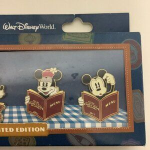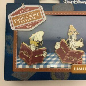 Walt Disney World Epcot Food and Wine Festival 2011 Boxed Pin Set featuring Mickey Mouse, Minnie Mouse, Donald Duck and Goofy Holding menus.