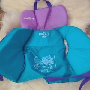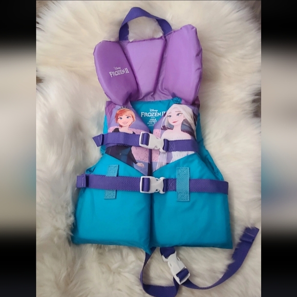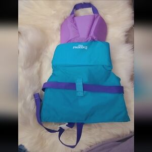 Purple and blue life jacket featuring Disney Frozen characters. Perfect for water activities. 💙💜