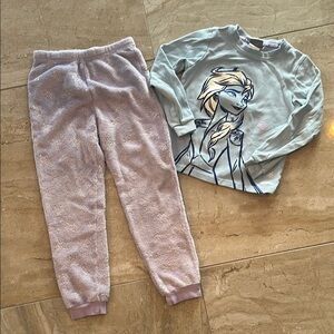 Cozy Disney Frozen pajama set. Features a blue top with a character print. Includes matching purple pants.