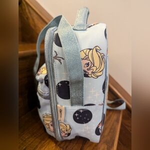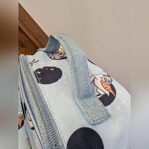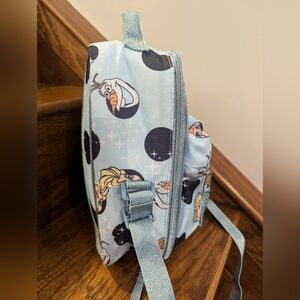 Cute light blue lunch bag featuring characters from Disney's Frozen. Perfect for fans of Elsa, Anna and Olaf. Multiple compartments for storage.