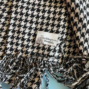 Add a touch of classic Disney magic to your wardrobe with this chic black and white houndstooth scarf! Finished with fringed ends and a silver rhinestone Minnie/Mickey Mouse brooch, this scarf brings a playful yet sophisticated vibe to any outfit. Perfect for Disney lovers and collectors alike.