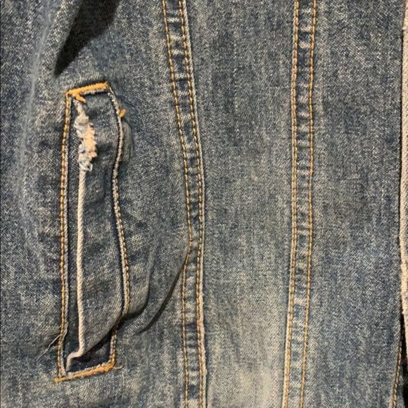 It’s slightly distressed in 3 spots (shoulder & pockets); see photos.