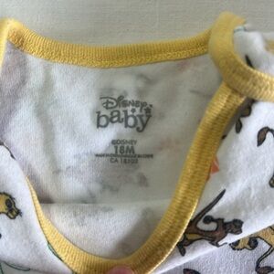 Charming Disney bodysuit with playful animal prints. Features a white base with yellow trim. Ideal for fun adventures.