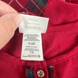Disney nightgown. Could honestly be worn as a dress! Light polyester material. Mickey and Minnie embroidered on the front in a Christmas holiday theme. Accent buttons. Red and blue plaid pattern with a ruffle trim and puff sleeves.