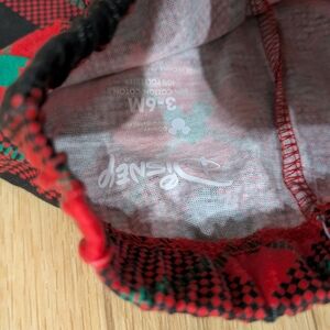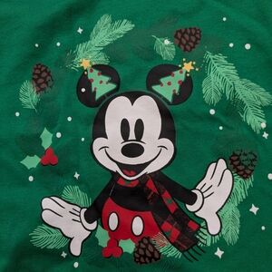 Adorable Disney pajama set with a green top featuring Mickey Mouse. Red and black plaid pants complete the look. Perfect for bedtime fun.