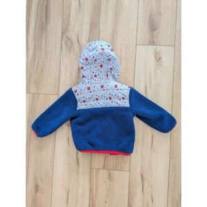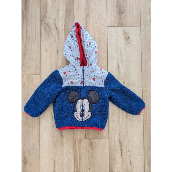 Cozy jacket with Mickey Mouse design. Blue and gray with red accents. Perfect for Disney fans.