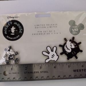 Limited edition Disney Mickey Mouse pin set. Features black and white designs.