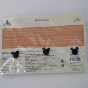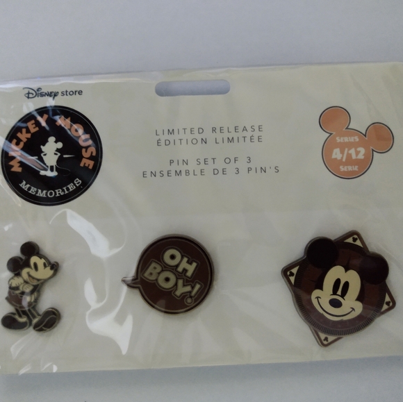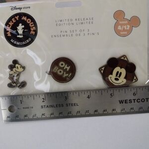 Set of three Disney Mickey Mouse pins. Features classic Mickey designs in brown tones.