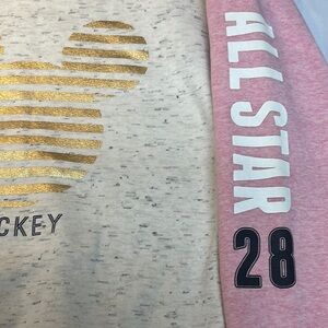 This Disney sweatshirt showcases a charming pink and cream color scheme, featuring a metallic gold Mickey Mouse silhouette on the front. The contrasting sleeves add a stylish touch, while the 'All Star' text on the sleeve enhances its playful appeal.
