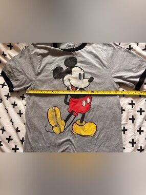 Soft gray ringer tee featuring black neckline and sleeve trim. Printed Disney logo and subtle graphic detail. Comfortable casual look for everyday wear.